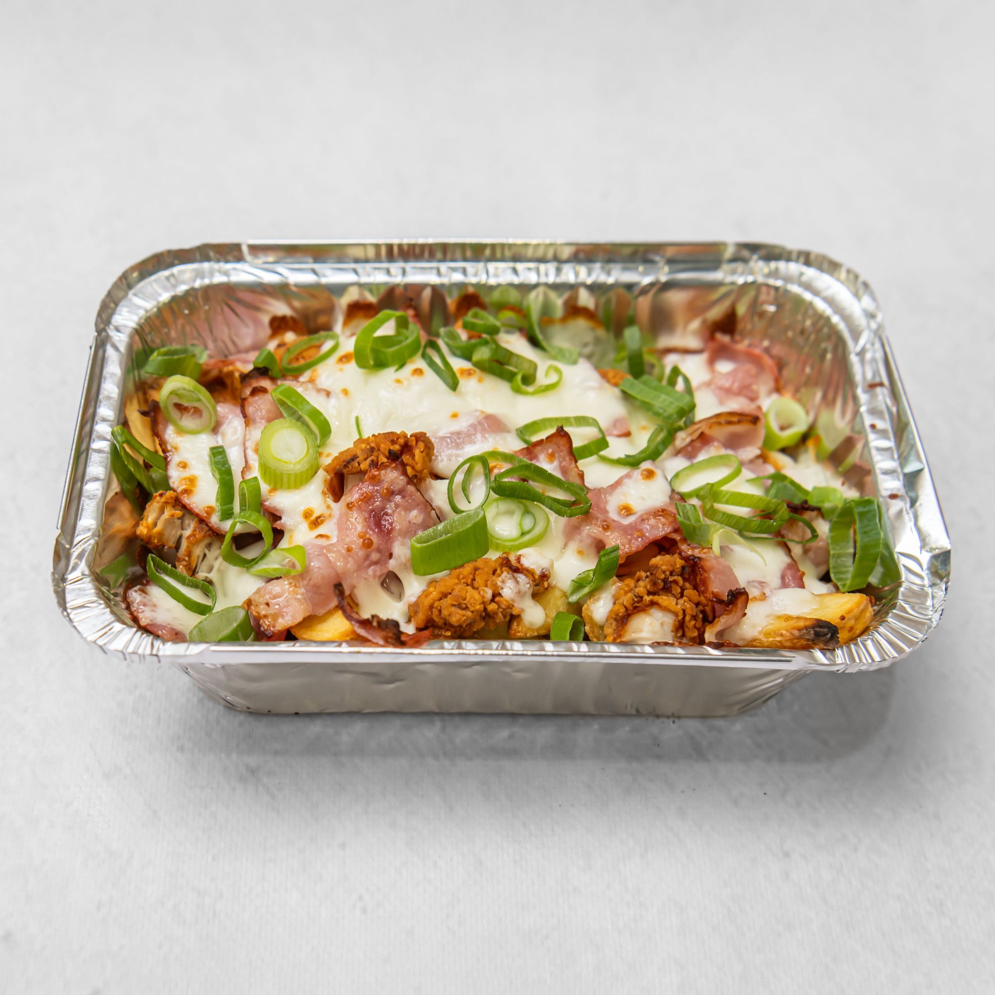 kurczak słodki chilli 200g, frytki 250g, sos tzatzyki, salsa. (waga przed obróbką) Opłata za opakowanie z tworzywa sztucznego -